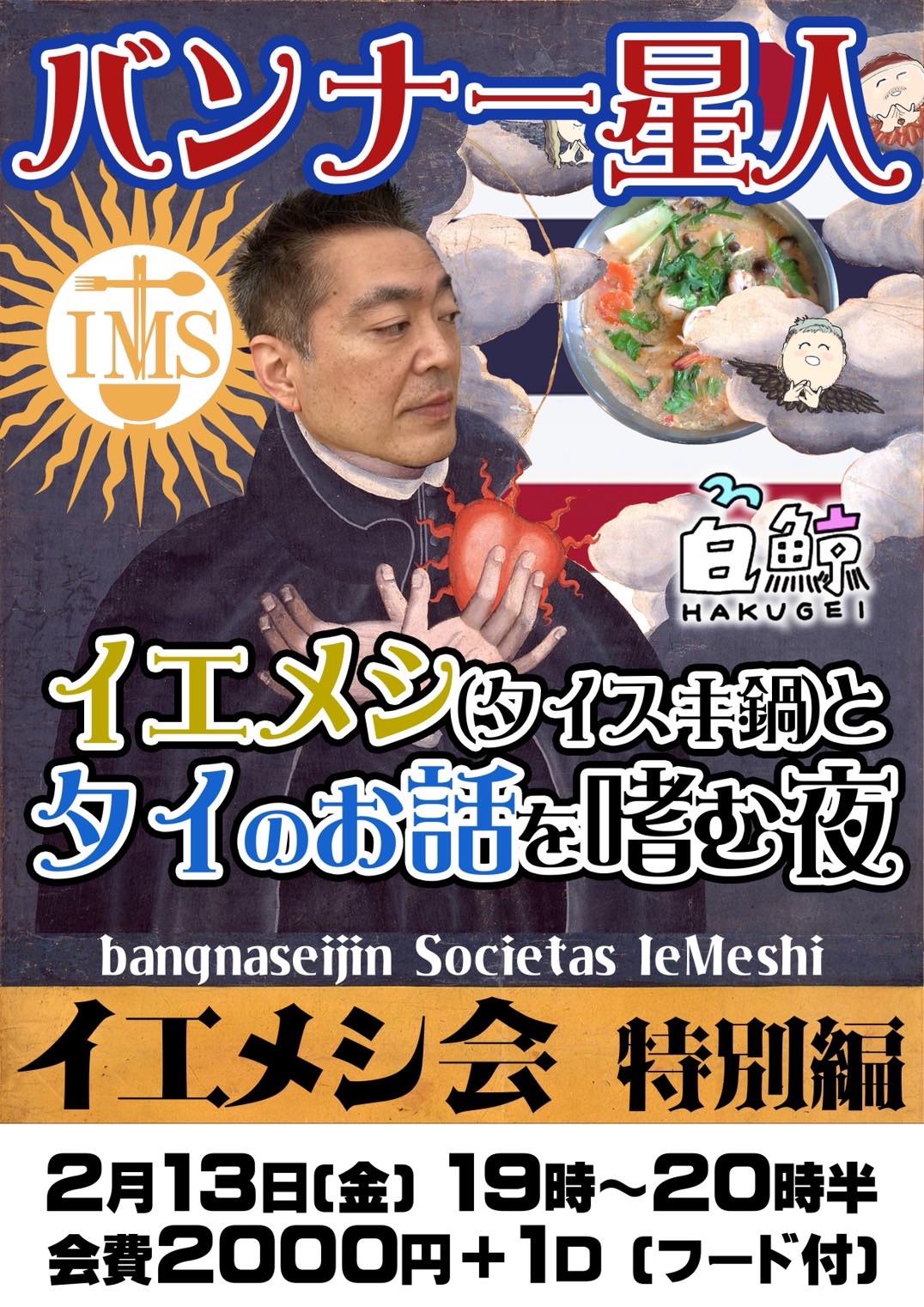 本場仕込みのタイスキ鍋をグツグツ煮込みながら、 みんなでゆるく、深く、タイの話を聞く・語る・笑う・驚く夜。ゲイ事情、心霊、グルメ、宗教、恋愛、結婚、仕事、オカルト。たくさんの話題を抱えて、寒い夜だからこそ、鍋は熱く、心はもっと熱く。